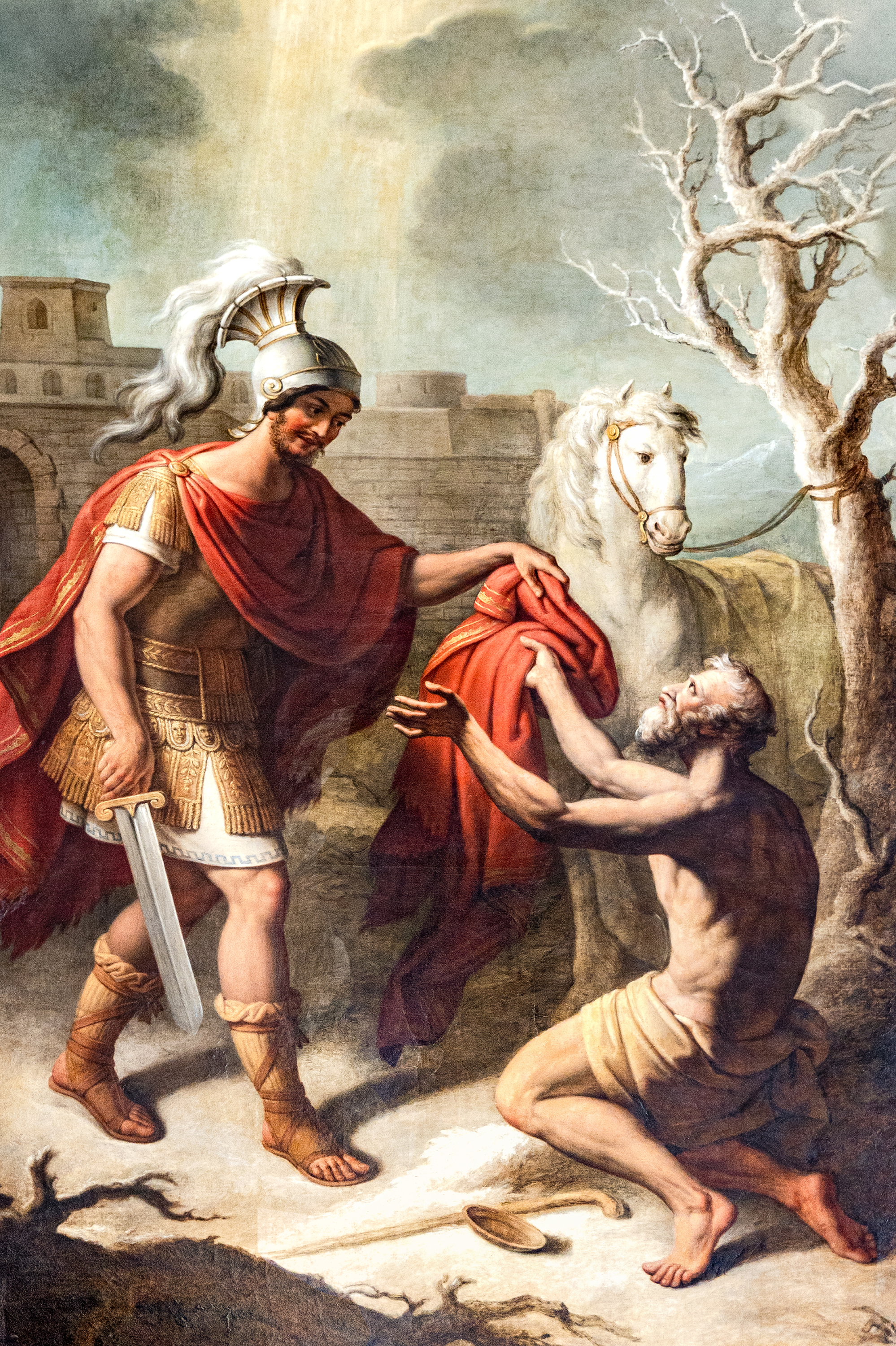 Da Martin weder Geld noch Essen bei sich hatte, griff er nach seinem Offiziersmantel, zerteilte ihn mit seinem Schwert in der Mitte und gab eine Hälfte dem vor Kälte zitternden Bettler.